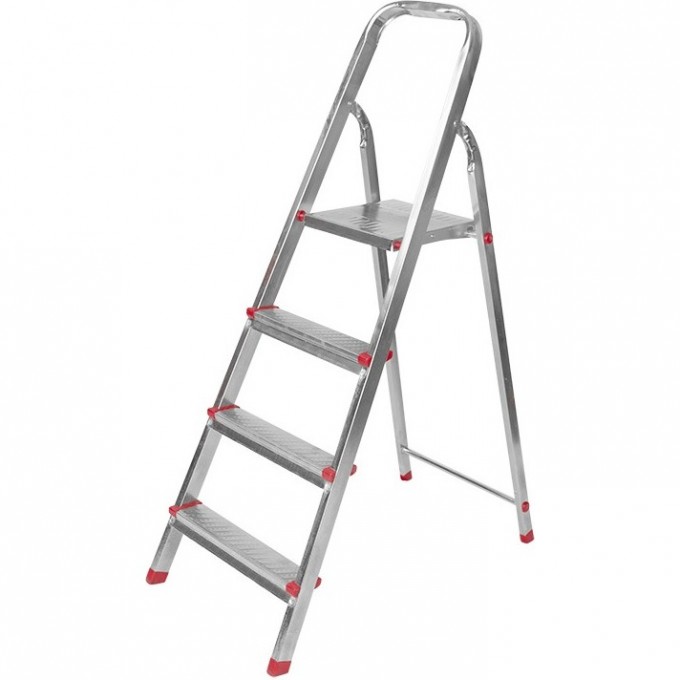 Стремянка металлическая состоит из 4 ступенек, применяется как в строительных целях, так и в быту, дома, на даче, в гараже и саду. Специальное соединительное ушко обеспечивает устойчивость конструкции и надежную фиксацию оборудования в рабочем положении. Ножки лестницы изготовлены в пластиковом покрытии; это предотвращает скольжение и защищает напольное покрытие от царапин, а упрочненное крепление ножек предотвращает их выпадение. Гальваническое покрытие гарантирует устойчивость к коррозии и защищает от негативного воздействия окружающей среды. Стремянка из усиленного профиля с 4 широкими ступенями с противоскользящим рифлением не занимает много места. Использование качественных материалов позволяет нагружать стремянку массой до 150 кг.